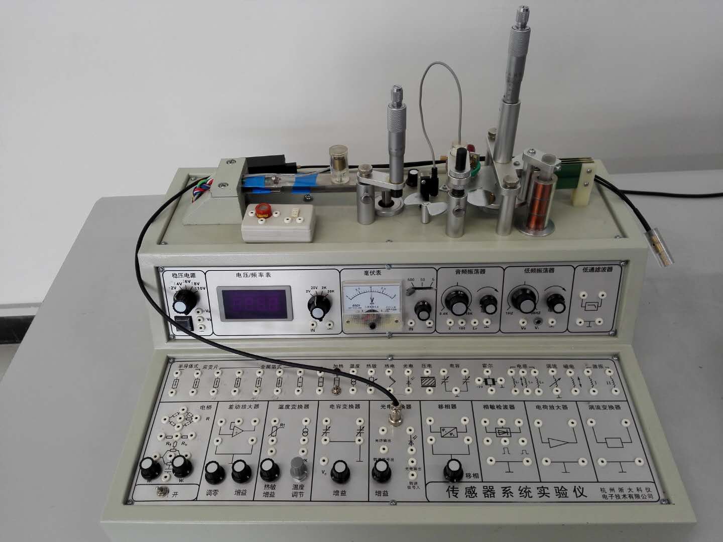 传感器实验室有CSY10A型传感器系统实验仪和CSY10G型光电传感器系统实验仪。CSY10A型传感器系统实验仪集被测体、各种传感器、信号激励源、处理电路和显示器于一体,可以组成一个完整的测试系统,能完成包含光、磁、电、温度、位移、振动、转速等内容的测试实验。CSY10G型光电传感器系统实验仪可将各种光电(光敏)传感器、被测体、信号源、仪表显示、信号采集、处理电路及实验所需的温度、位移、光源、旋转装置集中于一机,对十种光电传感器进行光电特性、光照特性、温度特性等二十余种实验。承担的实验课程包括本科生《传感器原理及应用》课程和研究生《检测新技术》课程。