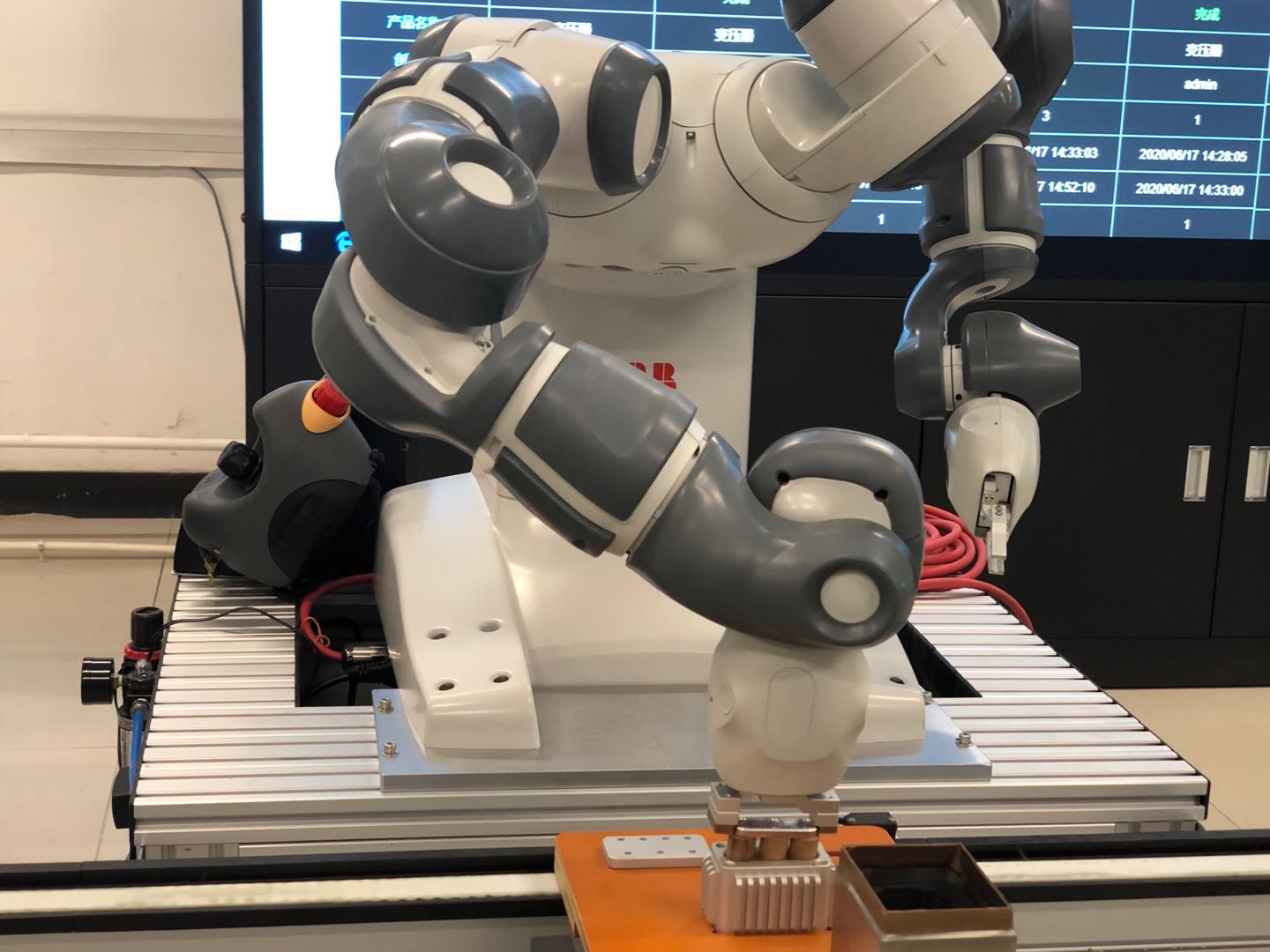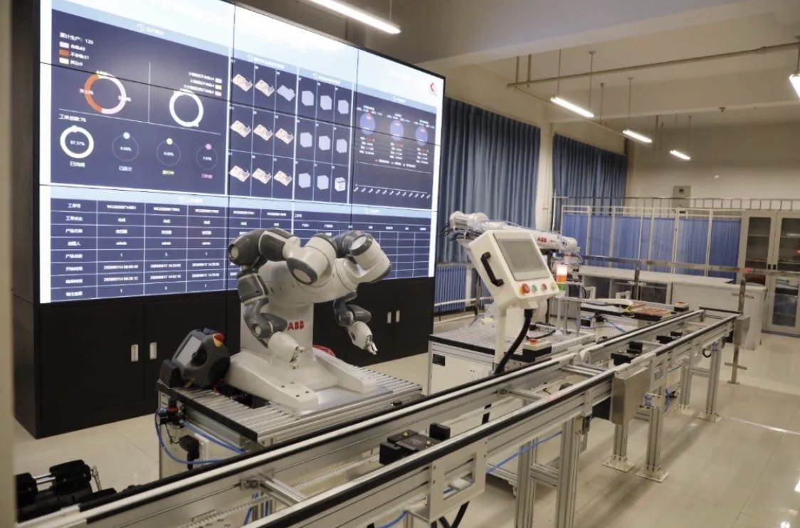 智能制造实验室实验平台以电力变压器为载体,通过MES系统能够实现产品取存、传送、装配、检测、装盒、码垛等流程的产品组装全生命周期运行状态的实时监控。平台采用了工业机器人技术、机器视觉技术以及智能仓储等多种先进技术,可实现柔性生产,通过RFID进行全流程可追溯,可用于智能工厂的整体展示与体验,智能制造先进技术的教学与全面实操。实验平台根据生产流水线流程分为:智能仓储单元、智能装配单元、智能检测单元、智能装盒码垛单元以及智能传送单元组成。其中智能装配单元采用了瑞士ABB的YUMI双臂工业机器人,在常规生产环境中可以实现与人类的并肩协作,从而实现人力与机器人资源的最大化利用,YUMI机器人具有安全性高、精度高、易用性、运动灵活等特点。智能装盒码垛单元利用了瑞士ABB六轴工业机器人来实现完成对已经组装完成以及通过质检后的产品装盒操作工作,以及对产品托盘和已装盒完成的成品码垛的操作工作。