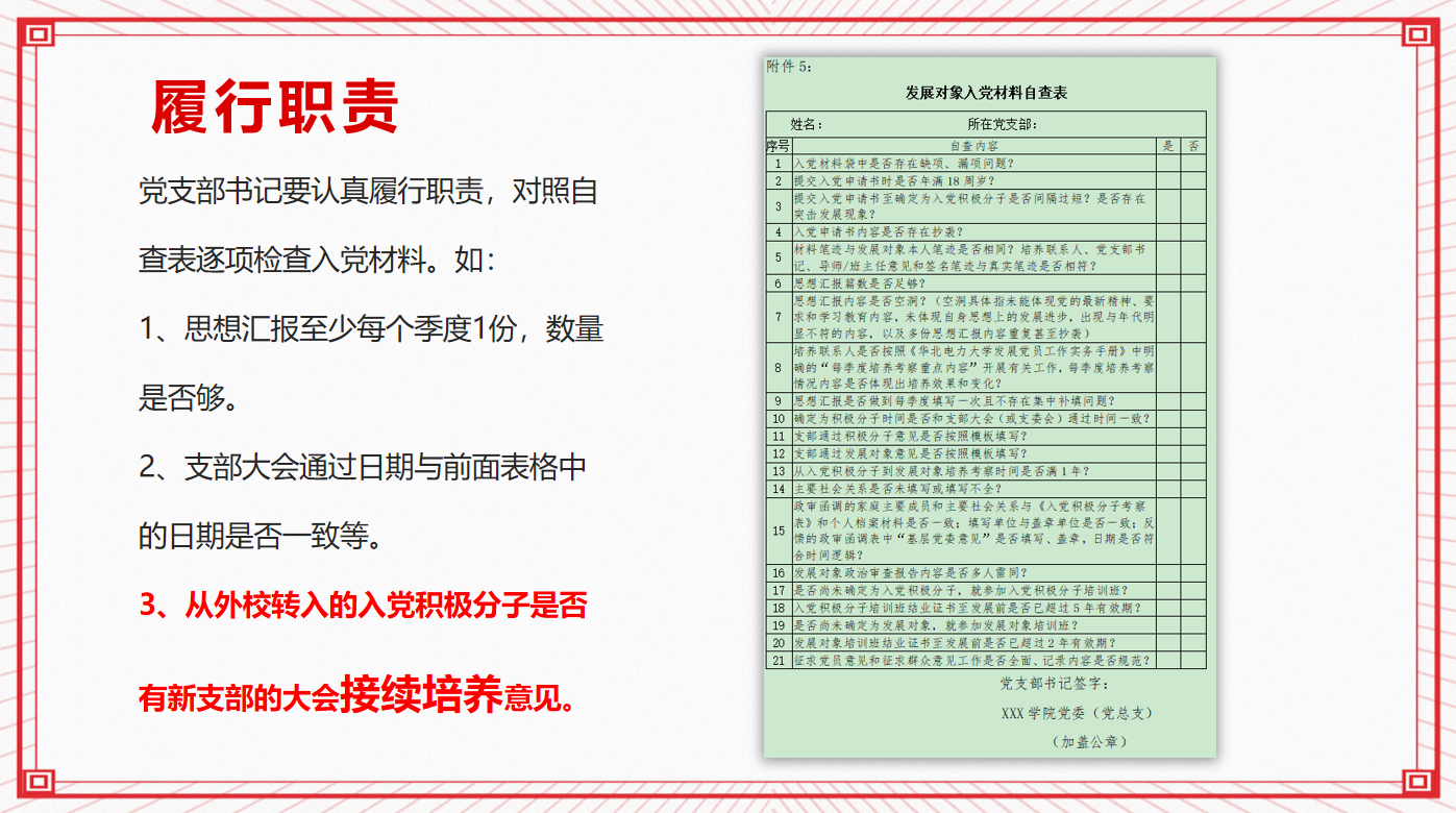 在会议中,董宏伟老师向大家介绍了培训发展党员的工作流程,详细讲解了发展党员程序总体要求,在发展党员程序的四个阶段中常见的问题,最后向大家强调了主要材料书写注意事项以及工作要点。