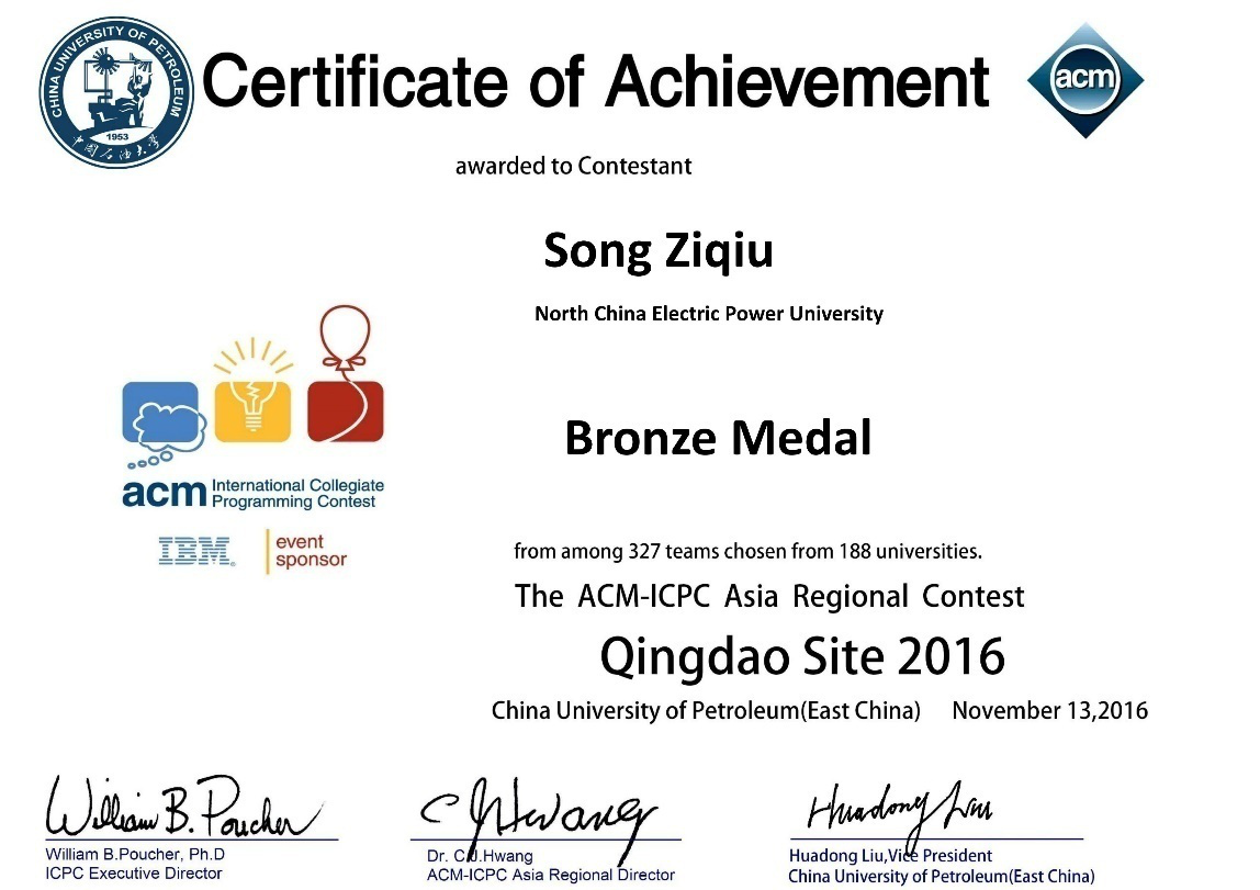 ACM/ICPC国际老员工程序设计大赛亚洲赛区青岛站铜牌