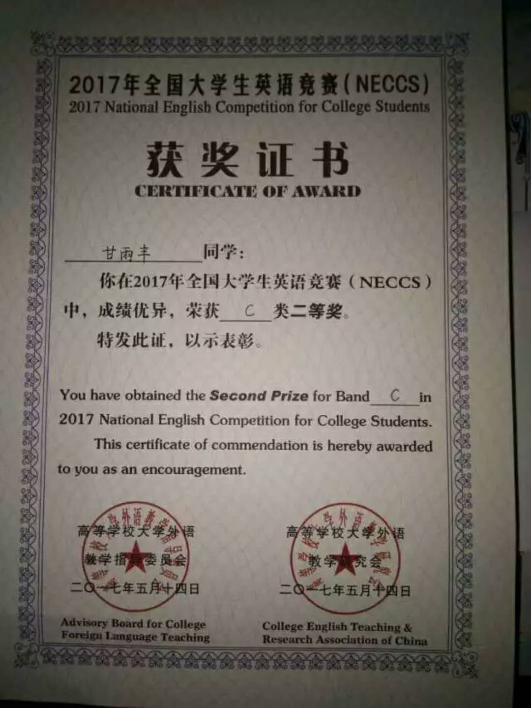 2017年参加全国老员工英语竞赛获得了C类二等奖,其实在这样一所工科大学中,能够坚持认真学习英语的人实属不多,我高考前对于英语近乎偏执的热爱还是给自己带来了一定的优势,虽然直接接触英语的机会减少很多,但是平时在代码的编写和资料的查询过程中还是会或多或少的接触到。英语竞赛之前我有把前期的竞赛试题拿出来练习过,靠着阅读积累的语感,最后也还算有不错的结果,英语这样的学科,是需要真正投入感情的。