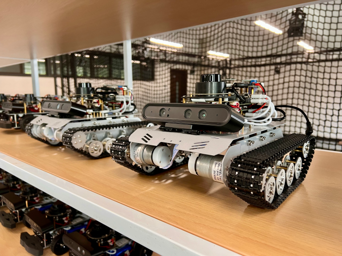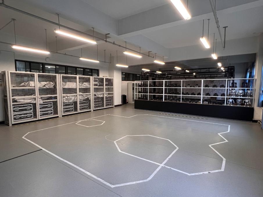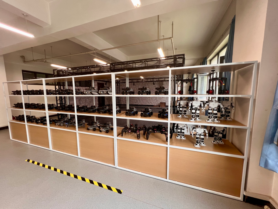 机器人综合实验室位于主楼E0218,现有面积144平米,实验室内包含17套四足智能机器狗、1套高精度三维动作捕捉系统、48套轮式/履带式智能车、以及人形机器人、六足机器人、多旋翼无人机等若干套。