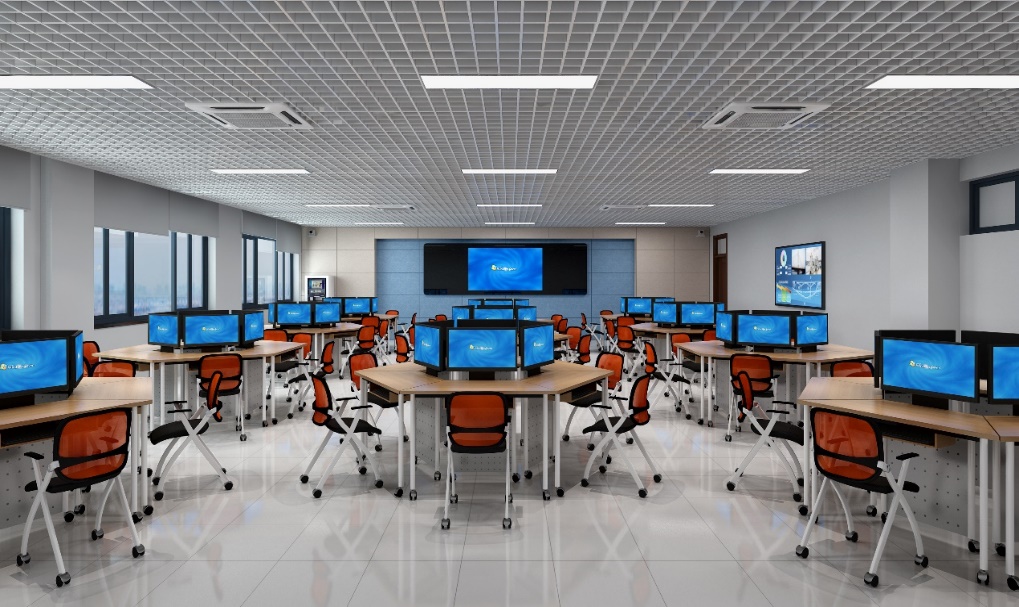 实验室配置的智慧教学系统由智慧黑板、功放、音箱、无线麦克及配套控制系统构成。可在智慧黑板上展示各种多媒体信息,支持多点触控及手势操作,手机画面可实时共享到黑板上,实现师生交互式课堂教学。云桌面系统实现了大规模分散、异构终端的统一管理和维护,可远程快速部署多种教学实验环境,满足个性化上课需求。实验室配置有六边形定制电脑桌,方便员工分组讨论。