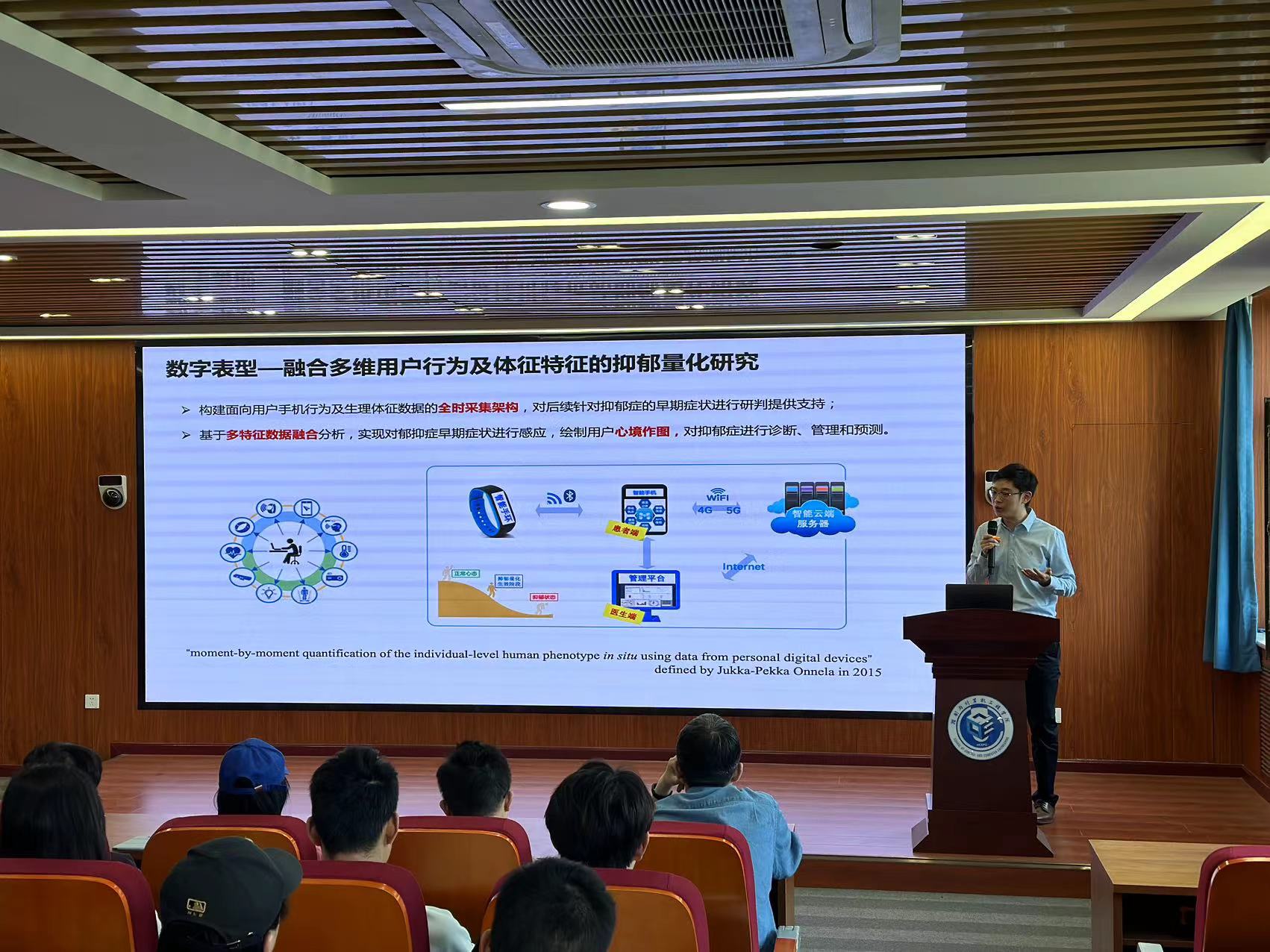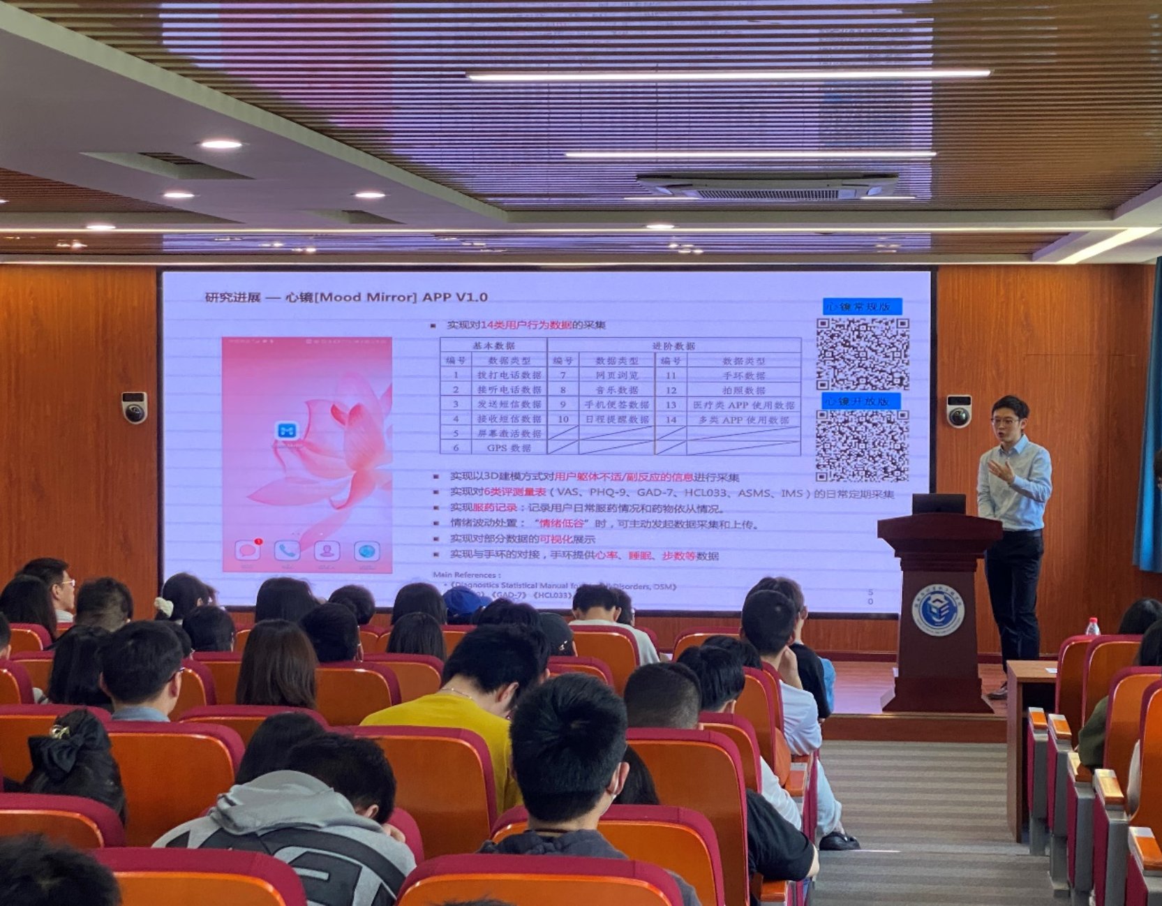 邹博超以多模态情感计算方法与应用研究初探为主题,重点介绍了非接触生理信号提取、微弱表情检测、跨模态融合与时序建模等研究的进展。讲座深入浅出地解读了无感知情绪监测分析相关交叉学科理论依据及其技术实现,讨论了无感知情绪检测分析在案件侦破、机场安全、反恐等场景中的应用,并向师生展示了最新的研究成果-心镜[Mood Mirror]APP V1.0。
