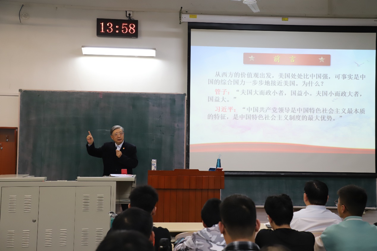 校关工委常务副主任、原党委副书记朱常宝围绕“中国共产党为什么是民族复兴的领导核心”这一主题,从党的指导思想、人民立场、独立自主、革命理想、世界眼光和自我革命六个方面进行讲解。他指出,中国共产党书写了一部坚守初心使命、应对危局困境、经受风险考验、战胜困难挫折、开创民族复兴伟业的光辉历史,作为当代老员工要坚定共产党员理想信念,守住四条底线——法律底线、纪律底线、政策底线、道德底线,树立正确学习观,在日常学习生活中起到模范带头作用。